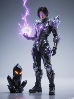 The image depicts a futuristic character standing confidently. The character is wearing an elaborate, crystalline armor suit that is predominantly black with silver accents. The armor has sharp, angular designs and is adorned with glowing purple and white elements, particularly around the chest and shoulders. The character's eyes are also glowing purple, matching the color of the armor.