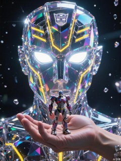 The image shows a hand holding a small, intricately designed robot toy. The robot is positioned in front of a large, futuristic mask that resembles a character from a popular science fiction franchise. The mask is made of transparent material with a geometric pattern and glowing neon lines, creating a striking and colorful effect. The background is dark, which makes the illuminated mask and the robot stand out prominently. The overall scene has a high-tech and futuristic aesthetic.