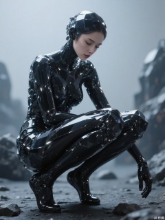 The image depicts a humanoid figure seated on the ground, wearing a sleek, black, geometric suit that appears to be made of reflective, faceted materials. The suit covers the entire body, including the head, with intricate, angular designs that give it a futuristic and almost robotic appearance. The figure is positioned in a contemplative pose, with its head slightly bowed and eyes closed, suggesting a moment of introspection or rest. The background consists of a misty, grayish landscape with rocky formations, adding a sense of otherworldliness to the scene. The lighting is soft and diffused, casting gentle shadows and highlighting the reflective surfaces of the suit.
