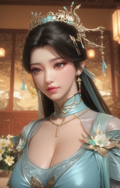 score_9,score_8_up,score_7_up,source_anime,<lora:qingxuan_xiyouqinv13_illust:0.7>,1girl,jewelry,beautiful_detailed_eyes,black hair,hair bun,long hair,blue dress,huge breasts,earrings,eyeshadow,makeup,necklace,jewelry,(beautiful_detailed_eyes:1.2),long sleeves,hair stick,hagoromo,hanfu,highly detailed,volumetric,dramatic lighting,oil,(shiny_skin:1.2),ultra detailed 8k cg,ultra detailed background,full_shot,2.5D,rating_explicit,chinese women,(realistic:1.3),perfect face,detailed face,sexy pose,supermodel,overall warm color,dol,(sunshine flower room:1.3),innocence,mysterious,surreal,film grain texture,analog photography aesthetic,dynamic composition,delicate details,highly detailed,concept art,extremely detailed,amazing quality,ultra-high resolution,32K UHD,sharp focus,best-quality,with a high-end texture,golden hour,unconventional supreme masterpiece,masterful details,temperate atmosphere,high detailed  skin,(detailed skin:1.1),highly detailed,nice hands,highly detailed,Skindentation,skin depression,<lora:Add_more_details_V2_XLpony:0.6>,dramatic lighting,detailed face,<lora:Expressive_H:1>,legs,(black stockings:1.2),(portrait:1.4),