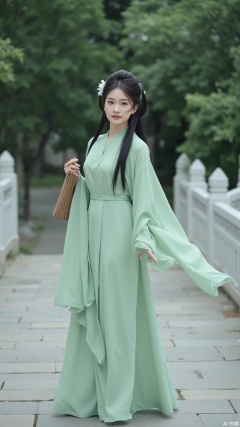 The image shows a young woman wearing a long, flowing green dress with a high neckline and long sleeves. She is standing on a stone pathway with trees and a white fence in the background. The woman has long black hair styled in a half-up, half-down hairstyle with a flower in her hair. She has a serious expression on her face and is holding a brown bag in her left hand. The dress is flowing and cascades down her back, creating a flowy silhouette. The overall mood of the image is elegant and graceful.