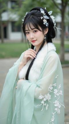 The image is a portrait of a young woman wearing a traditional Chinese Hanfu dress. She is standing in a park or garden with trees and a building in the background. The woman is wearing a light green robe with intricate white embroidery and a white fur collar. Her hair is styled in a half-up, half-down hairstyle with a flower crown on top. She has long black hair and is looking directly at the camera with a slight smile on her face. The overall mood of the image is peaceful and serene.