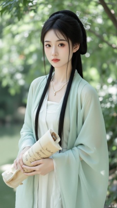 The image is a portrait of a young woman dressed in traditional Chinese clothing. She is standing in a garden with a tree in the background. The woman is wearing a green kimono with a white blouse underneath and has long black hair tied up in a bun. She has a serious expression on her face and is holding a scroll in her hands. The scroll appears to be old and worn, with some writing on it. The overall mood of the image is peaceful and serene.