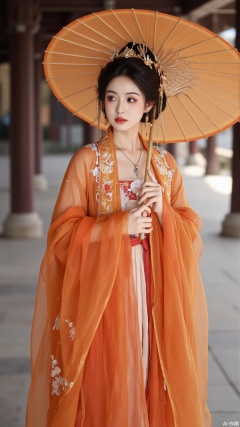The image is a portrait of a young woman dressed in traditional Chinese clothing. She is wearing a long orange robe with intricate gold embroidery and a matching headpiece. Her hair is styled in a high bun with a gold tiara on top. The woman is holding a large orange parasol in her right hand and is looking off to the side with a serious expression on her face. The background is blurred, but it appears to be an indoor space with a stone floor and pillars. The overall mood of the image is elegant and regal.