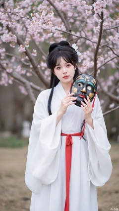 The image is a portrait of a young woman wearing a traditional Chinese Hanfu outfit. She is standing in front of a tree with pink cherry blossom trees in full bloom. The woman is wearing a white kimono with a red ribbon tied around her waist. She has long black hair styled in a half-up, half-down hairstyle with a flower in her hair. In her hand, she is holding a black mask with a colorful design on it. The mask appears to be a traditional mask with intricate details and patterns. The background is blurred, but it seems to be an outdoor setting with greenery and trees. The overall mood of the image is peaceful and serene.