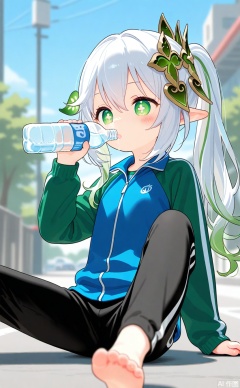 age_down,cxqbwhmasterpiece,best quality,high quality,loli,chromatic_aberration,1girl,solo,long hair,loli,loli,loli,(little_girl:1.2),petite:1.1,hair ornament, elf girls,pointy_ears, small breast,green eyes, symbol-shaped pupils, cross-shaped pupils, white hair, green hair, bangs, hair ornament, gradient hair, side tonytail, outdoors,long sleeves,long pants,Sportswear,holding bottle,drinking,sitting,street,cxnahida