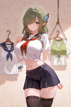 highres,sensitive,masterpiece,best quality,amazing quality,very aesthetic,absurdres,best quality,amazing quality,very aesthetic,absurdres,shiny skin,detail eyes,wallpaper,shiny skin,chosen_style_1,artist:ciloranko BREAKcurvy,(narrow waist:1.1),De Zeven Provincien \(azur lane\),pointy ears,green eyes,hair over one eye,large breasts,green hair,butterfly hair ornament,disheveled hair,hair over shoulder,student,JK,school uniform,sailor dress,sailor collar,pleated skirt,black thighhighs,navel,hanging shirt,<lora:De Zeven Provincien (azur lane):0.5>,<lora:chosen_style_1:0.5>,