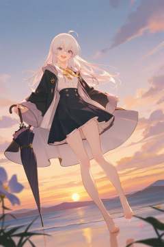 artist:ask_(askzy),artist:yolanda,[artist:WANKE],artist:ciloranko BREAK Simple Flat Coloring,shiny skin,very aesthetic,high definition,masterpiece,illustration,best quality, - 1girl, elaina \(majo no tabitabi\), umbrella, holding, solo, ahoge, holding umbrella, skirt, blue eyes, outdoors, sky, long hair, barefoot, shirt, open mouth, cloud, white shirt, smile, high-waist skirt, bangs, blurry foreground, long sleeves, flower, :d, blurry, neck ribbon, sunset, upper teeth only, white hair, full body, ribbon, hair between eyes, collared shirt, bare legs, star \(sky\), cloak, open clothes, black skirt