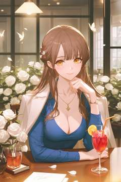 artist:ask_(askzy),artist:yolanda,[artist:WANKE],artist:ciloranko BREAK Simple Flat Coloring,shiny skin,very aesthetic,high definition,masterpiece,illustration,best quality, -1girl, solo, long hair, brown hair, smile, butterfly, flower, drinking glass, looking at viewer, cup, long sleeves, table, white flower, bangs, bug, necklace, closed mouth, breasts, drinking straw, jewelry, yellow eyes, jacket, sitting, rose, signature, cleavage, white rose, braid, brown eyes, indoors, collarbone, book, petals, blush, upper body, jacket on shoulders, blue shirt