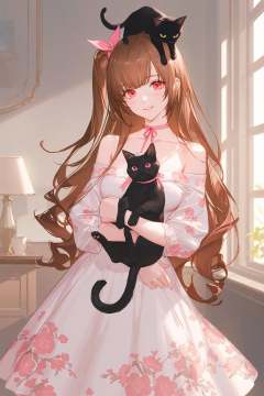 artist:ask_(askzy),artist:yolanda,[artist:WANKE],artist:ciloranko BREAK Simple Flat Coloring,shiny skin,very aesthetic,high definition,masterpiece,illustration,best quality, -1girl, cat, animal, brown hair, solo, long hair, holding, dress, collarbone, looking at viewer, bare shoulders, bangs, red eyes, smile, choker, holding animal, blush, ribbon, breasts, signature, black cat, hair ribbon, one side up, holding cat, long sleeves, animal on head, parted lips, on head, cat on head, window, floral print, indoors, white dress, pink ribbon, off shoulder