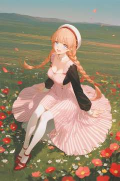 artist:ask_(askzy),artist:yolanda,[artist:WANKE],artist:ciloranko BREAK Simple Flat Coloring,shiny skin,very aesthetic,high definition,masterpiece,illustration,best quality, -1girl, solo, smile, field, vertical stripes, striped skirt, flower, striped, long hair, vertical-striped skirt, looking at viewer, braid, flower field, breasts, petals, open mouth, red flower, :d, twin braids, skirt, from above, white pantyhose, blue eyes, outdoors, shirt, pantyhose, white headwear, shoes, long sleeves, medium breasts, dress, black shirt, red footwear, bangs, cleavage, striped dress