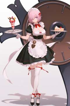 artist:ask_(askzy),artist:yolanda,[artist:WANKE],artist:ciloranko BREAK Simple Flat Coloring,shiny skin,very aesthetic,high definition,masterpiece,illustration,best quality, -1girl, mash kyrielight, breasts, tray, alternate costume, shield, lord camelot \(fate\), solo, apron, hair over one eye, white background, short hair, purple eyes, holding tray, short sleeves, holding, thighhighs, food, cleavage, simple background, maid headdress, maid, ankle ribbon, wrist cuffs, large breasts, looking at viewer, enmaided, cup, sundae, dress, smile, puffy short sleeves, waist apron, bow, full body, black footwear, frills, leg ribbon, ice cream, puffy sleeves, black dress, teacup, white thighhighs, maid apron, standing, holding shield, pink hair, cake, coffee, cake slice, parfait, gloves, shoes, bowtie, ribbon, light purple hair, bangs, badge, fruit, white apron, jewelry, closed mouth, strawberry, socks, spoon, frilled apron