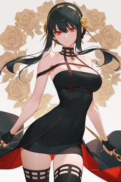 artist:ask_(askzy),artist:yolanda,[artist:WANKE],artist:ciloranko BREAK Simple Flat Coloring,shiny skin,very aesthetic,high definition,masterpiece,illustration,best quality, -1girl, yor briar, solo, breasts, dress, red eyes, hairband, black hair, black dress, weapon, gloves, gold hairband, holding, thighhighs, hair ornament, fingerless gloves, cleavage, flower, looking at viewer, holding weapon, black gloves, large breasts, jewelry, two-sided dress, earrings, two-sided fabric, bare shoulders, sidelocks, hair flower, simple background, black thighhighs, dagger, closed mouth, rose, long hair, bangs, white background, knife, cowboy shot, dual wielding, gold earrings, hair between eyes