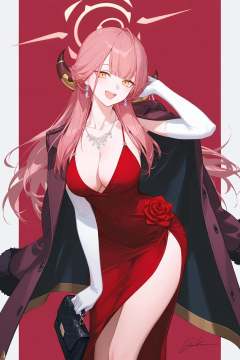 artist:ask_(askzy),artist:yolanda,[artist:WANKE],artist:ciloranko BREAK Simple Flat Coloring,shiny skin,very aesthetic,high definition,masterpiece,illustration,best quality, -1girl, aru (blue archive),gloves, jewelry, solo, white gloves, horns, breasts, dress, long hair, pink hair, necklace, earrings, looking at viewer, smile, holding, cleavage, open mouth, bangs, red dress, :d, halo, signature, blush, red background, coat on shoulders, rose, large breasts, elbow gloves, holding bag, yellow eyes, jacket on shoulders, collarbone, bag, jacket, thighs, handbag, standing