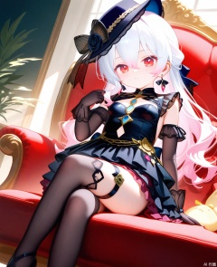 masterpiece,high quality,best quality,1loli,solo,upper body,long hair,breasts,red eyes,gloves,hat,dress,hair between eyes,jewelry,pink hair,white hair,multicolored hair,earrings,black gloves,black dress,thighhighs,footwear,high heels,short dress,thigh strap,jikan,fczj,transparent
