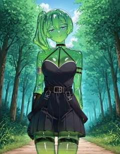 amazing quality,very aesthetic,absurdres,best quality,newest,masterpiece,4k resolution,highres, very aesthetic, detailed background, centered, view, focus,solo, female, 1girl, detailed eyes,day, forest, sadisitc smile, licking lips, <lora:Ubel:1>, Ubel_(Sousou_no_Frieren), purple_eyes, green_hair, medium_hair, side_ponytail, medium_breasts, black_dress, pleated_dress, sleeveless_dress, halterneck, o-ring_choker, black_choker, arm_strap, armlet, thigh_strap, black_belt, belt_buckle, single_elbow_glove, black_gloves, wizardslimus, goo girl, green skin color, slime skin, green hair, translucent head, translucent body, translucent hair, translucent face, <lora:wizardslimev25:0.8>, see-through skin, see-through head, slime girl, slime hair,