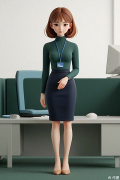 A cartoon blind box trendy toy,the whole body,a slim girl,red-brown hair,black eyes,a faint smile,standing in front of a spacious Office cubicle with dark green partition and white desktop before the white wall,Blue cushioned steel leg office chair,There is only a white vintage computer on the desktop,she is wearing a deep green tight-fitting turtleneck and navy blue half-body straight tube skirt,the high saturation pure blue card with a high saturation pure blue lanyard hung around her neck,beige court shoes,dark green carpet,clean background,chibi,