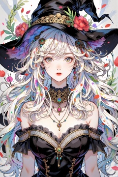 1girl, solo, long hair, breasts, looking at viewer, bangs, hair ornament, hat, dress, cleavage, bare shoulders, jewelry, flower, white hair, multicolored hair, earrings, hair flower, black dress, lips, grey eyes, petals, witch hat, gem,masterpiece,facing the lens,best quality,very aesthetic,extremely delicate and beautiful,huge filesize,amazing quality,32K UHD,extremely delicate and beautiful,best quality,artistic style,fashionable,cool and fashionable,A shot with tension,impactful picture,offcial art,movie perspective,masterpiece,facing the lens,best quality,very aesthetic,extremely delicate and beautiful,huge filesize,amazing,shadow
