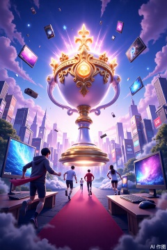 a poster for a gaming e-sports event featuring a huge champion Holy Grail shining brightly in the center, surrounded by 4 characters running towards the center, floating devices such as mobile phones, computers, keyboards, and mice in the air, ultra wide angle, large scene, and panoramic view of a city,