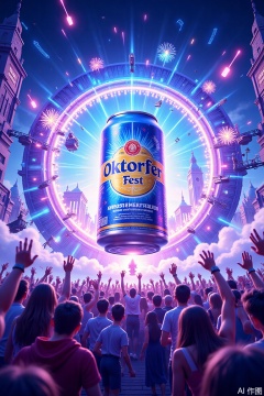 A vibrant Oktoberfest poster,dominated by blue-purple hues,with a giant can in the center surrounded by energetic crowd silhouettes dancing under dazzling stage lights with musical notes and fireworks in the background,ultra-realistic,8k,high-detail,movie-like lighting.A dynamic and lively summer party scene with a close-up of a beer can,colorful neon lights and musical waveforms radiating out in a bold blue-violet color scheme with high contrast and vibrant colors.It's a surreal depiction of a musical Oktoberfest with a huge circular ring stage in the center surrounded by cheering crowds,audience hands that can't block the line of sight and the main frame,medium to long view,dreamy blue and purple color palette,digital painting,very detailed and imaginative.,