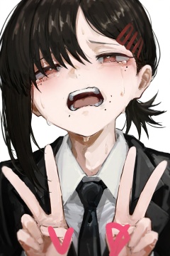 highres,absurdres,Visual impact,masterpiece,amazing quality,best quality,very aesthetic,very awa,newest,<lora:pikuson-Style-000060>,1girl, higashiyama kobeni, solo, mole, v, double v, necktie, black necktie, black hair, simple background, white background, shirt, hairclip, collared shirt, hair ornament, mole under eye, black jacket, open mouth, mole under mouth, white shirt, single sidelock, formal, suit, jacket, sweat, short hair, upper body, short ponytail, suit jacket, tears, medium hair, looking at viewer, crying, multiple moles, teeth