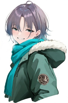 highres,absurdres,Visual impact,masterpiece,amazing quality,best quality,very aesthetic,very awa,newest,<lora:pikuson-Style-000060:0.8>,1girl, asakura toru, solo, ahoge, looking at viewer, simple background, hood, smile, upper body, earrings, multicolored hair, cropped torso, scarf, gradient hair, white background, jacket, jewelry, fur trim, short hair, blue hair, hooded jacket, green jacket, blush, grin, parted bangs, breath, fur-trimmed hood