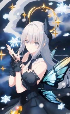 liv(PGR),1girl, solo, long hair, breasts, looking at viewer, bangs,cleavage, hair between eyes, bare shoulders, medium breasts, closed mouth, short sleeves, grey hair, detached sleeves, puffy sleeves, puffy short sleeves, grey eyes, black bow, halo,upper body, from above, snowflakes, (Tyndall Effect 1.4), (wlop:0.8),((artist:reoen),(artist:fuzichoco),(artist:atdan),(artist:torino_aqua),year 2024:0.8),[artist:wlop],[artist:ningen_mame],artist:ciloranko,[[artist:rhasta]],artist:tidsean,colorful,best quality,very aesthetic,absurdres,32K UHD,sharp focus,best-quality,Emotionalization,temperate atmosphere,with a high-end texture,in the style of fashion photography,Dynamic, dynamic force picture, (Visual impact:1.2),impactful picture,offcial art,