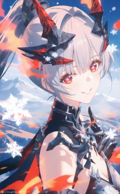 1girl,nanami,solo, long hair,horns,cross shaped pupils,ponytail,breasts, bangs, red eyes, grey hair, armor,  headgear,upper body, naughty smile,snowflakes, (Tyndall Effect 1.4), (wlop:0.8),((artist:reoen),(artist:fuzichoco),(artist:atdan),(artist:torino_aqua),year 2024:0.8),[artist:wlop],[artist:ningen_mame],artist:ciloranko,[[artist:rhasta]],artist:tidsean,colorful,best quality,very aesthetic,absurdres,32K UHD,sharp focus,best-quality,Emotionalization,temperate atmosphere,with a high-end texture,in the style of fashion photography,Dynamic, dynamic force picture, (Visual impact:1.2),impactful picture,offcial art,