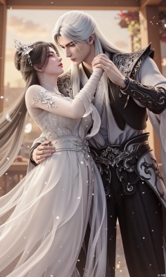 The image shows a romantic scene between a man and a woman. The man is wearing a black and white outfit with intricate designs on his chest and sleeves. He has long white hair and is looking down at the woman with a serious expression on his face. The woman is also wearing a white dress with a flower crown on her head. They are standing in front of a window with a view of a city skyline in the background. The overall mood of the image is one of love and romance.