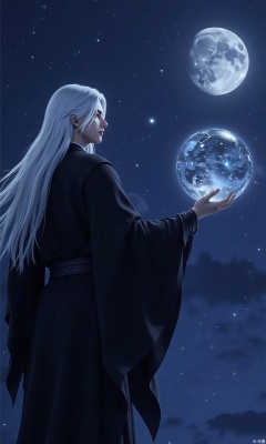 The image shows a person with long white hair, wearing a black robe, standing in front of a night sky with a full moon in the background. The person is holding a large crystal ball in their right hand and appears to be looking up at it with a peaceful expression on their face. The crystal ball is glowing blue and has intricate patterns and designs on it. The sky is filled with stars and the moon is partially visible in the top right corner. The overall mood of the image is mystical and mystical.