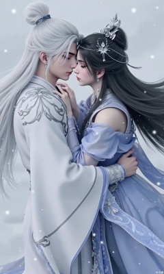The image shows a romantic scene between a man and a woman. The man is wearing a white robe with intricate designs on it, while the woman is dressed in a blue dress with long black hair. They are standing in front of a cloudy sky with white snowflakes falling around them. The woman is leaning in to kiss the man on the cheek. The overall mood of the image is peaceful and serene.