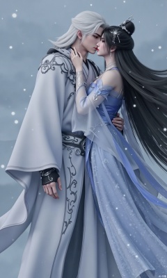 The image shows a romantic scene between a man and a woman. The man is wearing a white robe with intricate designs on it, while the woman is dressed in a blue dress with long black hair. They are standing in front of a cloudy sky with white snowflakes falling around them. The woman is leaning in to kiss the man on the cheek. The overall mood of the image is peaceful and serene.