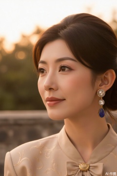 At dusk in the Temple of Heaven, a close-up captures the moment an elegant lady looks back. Her sapphire earrings glint with a cold light, and her beige cheongsam is suffused with the glow of the setting sun. The collision of warm and cool tones freezes this stunning instant..,plns,zhj