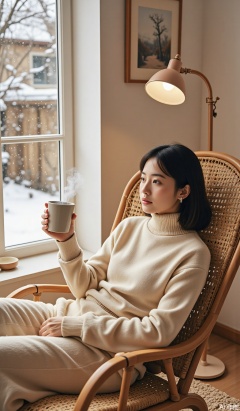 Mixed-blooded face woman curled up in a rattan rocking chair in a beige turtleneck sweater, holding a steaming mug in her hand and staring at the snowy scene outside the window. The living room design that combines Nordic style and gentle wind. The panoramic glass window shows the dry landscape courtyard covered with snow. The portrait is realistic, two-tone tone temperature light, and the floor lamp is warm and halo dyed