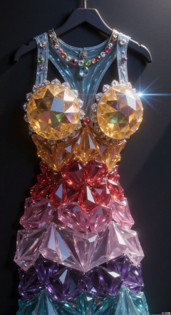 From a macro perspective, a rainbow seven-color gradient crystal dress is hung on a black minimalist hanger. Gems are closely arranged to form a gorgeous gradient, embellished with metal buckles at the collar and hem. The slim fit highlights the body curves, and the fluffy skirt is covered with crystal gems. Lit from the upper side, it creates delicate highlights and shadows, and the gems refract colorful halos. The shadow of the hanger contrasts with the luster of the dress, high