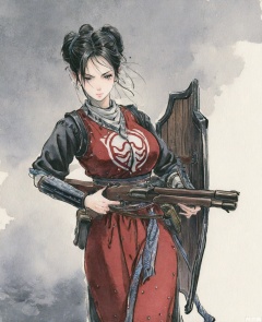 ((very awa)),solo,highly detailed,(best quality),((masterpiece)),1girl,chi,,ge,,traditional media,painting \(medium\),watercolor \(medium\),looking_at_viewer,(mature_female),large breasts,serious,kubrick_stare,nvbing,hair bun,black hair,cowboy_shot,,gun,shield,