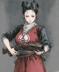 ((very awa)),solo,highly detailed,(best quality),((masterpiece)),1girl,chi,,ge,,traditional media,painting \(medium\),watercolor \(medium\),looking_at_viewer,(mature_female),large breasts,serious,kubrick_stare,nvbing,hair bun,black hair,cowboy_shot,,gun,