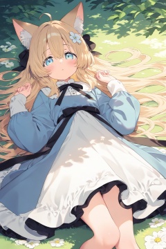 1girl, animal ears, flower, dress, blue eyes, lying, solo, ribbon, long hair, bangs, looking at viewer, hair ornament, long sleeves, bow, hair between eyes, blonde hair, blush