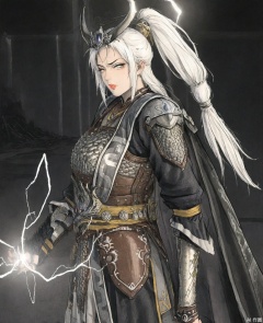 ((very awa)),solo,highly detailed,(best quality),((masterpiece)),1girl,chi,,ge,,traditional media,painting \(medium\),watercolor \(medium\),looking_at_viewer,,miaoying,armor,white hair,long hair,horns,ponytail,cape,(mature_female),white eyes,disdain,upper_body,large breasts,glaring,serious,kubrick_stare,disgust,electricity,lightning,