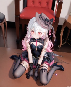 masterpiece,high quality,best quality,1loli,jikan,solo,sit on the floor,long hair,breasts,red eyes,gloves,hat,dress,hair between eyes,jewelry,pink hair,white hair,multicolored hair,earrings,black gloves,black dress,(white thighhighs),footwear,high heels,short dress,thigh strap