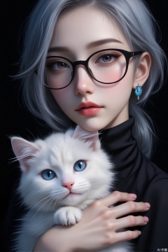 The image depicts a person with light gray hair and glasses, wearing a black turtleneck. They have a blue gemstone earring and are holding a fluffy white cat with striking blue eyes. The background is dark, which contrasts with the bright colors of the person and the cat. The overall atmosphere is serene and intimate, with the cat appearing calm and the person gently cradling it.
