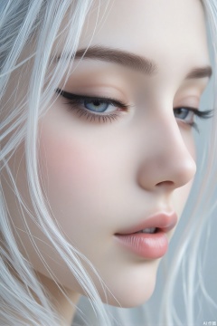 The image depicts a close-up of a person's face, focusing on their right side. The individual has long, white hair that partially covers their forehead. Their skin is smooth and pale, with a subtle blush on their cheeks. The person's eye is visible, featuring long, delicate eyelashes and a blue iris. The eye is closed, giving a serene and contemplative expression. The background is blurred, creating a soft, dreamy effect that complements the overall ethereal appearance of the person.