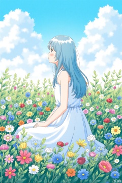 Best quality, masterpiece, illustration, (reflection of light), extremely absurd detail, (movie poster), (signature: 1.3)English text: 1.3), 1 girl, girl among flowers, profile, pure sky blue hair, black eyes, clear sky, outdoors, clavicle, sitting a paintbrush painting, wilderness long hair, clear fabric boundary, white dress, fantasy landscape, floral ground, thousands of flowers, colorful flowers, surrounding flowers,