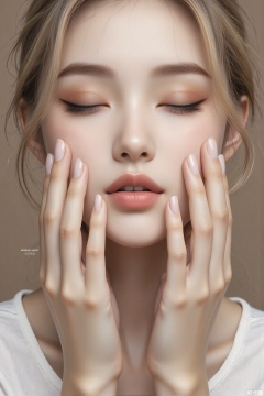 The image depicts a close-up of a person's face, focusing on their hands and lips. The person has light skin, blonde hair, and is wearing a white top. Their eyes are slightly closed, and they have a subtle expression. The hands are gently touching the cheeks, with the fingers delicately placed. The background is a solid, muted color, providing a clear contrast to the subject. The image is signed "BEARDED UNCLE AUGIC DESIGN" in the bottom right corner,oily
