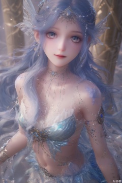 score_9,score_8_up,score_7_up,1girl,solo,long hair,breasts,looking at viewer,grey eyes,very long hair,necklace,earrings,hair ornament,dress,cleavage,jewelry,closed mouth,blue hair,earrings,gem,pillar,armlet,bent over