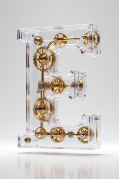 beijihui,3D icon design of letter 'E',**** of transparent high-polymer shell encasing gleaming golden micro-gear mechanisms with visible hydro-cylinders and polished bearings,hyperrealistic,hyperdetail,front view,studio lighting,100mm lens,white solid background,