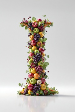 beijihui,3D icon design of letter 'I',**** of a vibrant assortment of fruits and vegetables--glossy apples,textured carrots,dewy grapes--arranged in a cohesive form,hyperrealistic,hyperdetail,front view,studio lighting,100mm lens,white solid background,