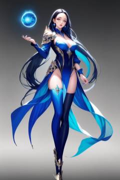 <lora:20250501_AgainGameCharacterLora:1>, 1girl, long hair, solo, breasts, thighhighs, black hair, jewelry, full body, earrings, blue eyes, asymmetrical legwear, gradient background, very long hair, shoulder armor, dress, cleavage, magic, mismatched legwear, parted lips, looking at viewer, asymmetrical clothes, detached sleeves, blue thighhighs, pelvic curtain, grey background, armor, medium breasts, parted bangs, leotard, blue hair, floating, standing, orb, pauldrons, highleg, blue dress, floating hair, multicolored clothes, floating object, groin, large breasts, fingernails, asymmetrical footwear, single thighhigh, white dress, multicolored hair, long legs, single pauldron, highleg leotard, white thighhighs, thighs, hands up, no panties, long sleeves, detached collar, simple background, nail polish, forehead, blue nails
