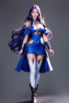 <lora:20250501_AgainGameCharacterLora:1>, 1girl, breasts, solo, long hair, very long hair, jewelry, earrings, thighhighs, full body, shoulder armor, cleavage, dress, purple hair, looking at viewer, blue eyes, armor, pauldrons, large breasts, black thighhighs, blue dress, standing, red lips, grey background, lips, covered navel, gem, parted lips, short dress, simple background, boots, blue footwear, medium breasts