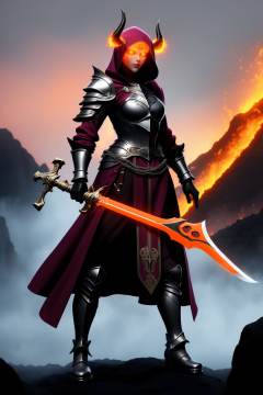 <lora:20250501_AgainGameCharacterLora:1>, 1girl, weapon, armor, holding, horns, solo, holding weapon, fire, sword, glowing eyes, lava, full body, looking at viewer, standing, shoulder armor, mask, breasts, holding sword, gauntlets, long hair, boots, glowing, flaming weapon, pauldrons, hood, yellow eyes, medium breasts, red dress, dress, chain, brown hair, hood up, armored boots, gloves, breastplate, demon horns, colored skin, axe, boobplate, orange eyes, skull